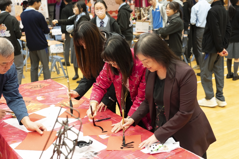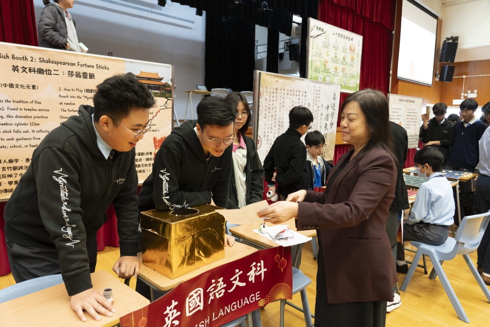 A highlight was the booths held by different subjects and parties, including Chinese, Chinese History, Science, Maths, English, Citizenship & Social Development, Chess Club and Religious Committee. Besides, all F.3 classes were responsible for their booths in promoting intangible Chinese heritage ranging from Chinese knots, flour dolls, seals to flower plaques.