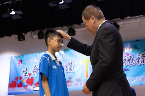 校監余恩明牧師為中一同學按手祝福。